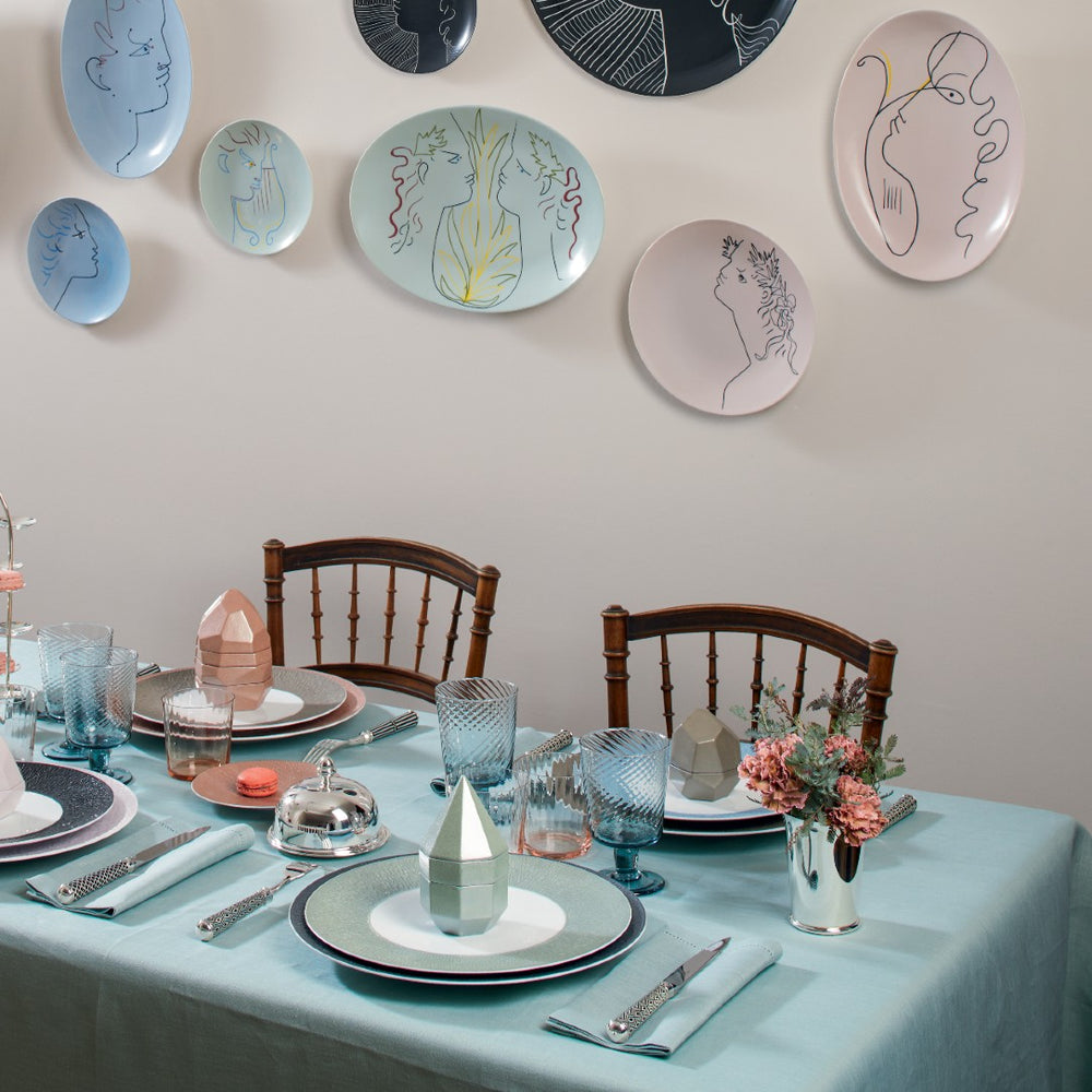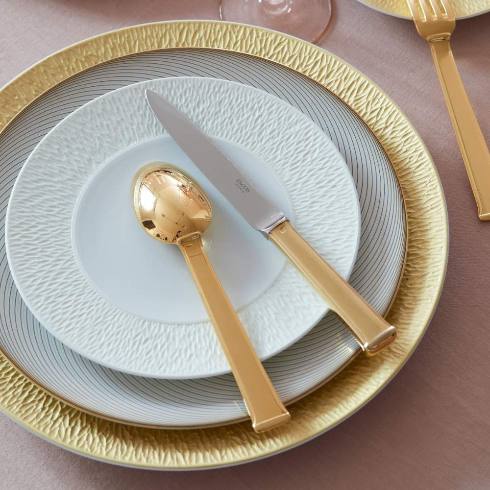 The Minéral collections, Minéral Gold, Minéral Platinum, Minéral Irisé Céladon, Minéral Irisé Sky Blue, and Minéral White, bring together matte and glossy finishes, subtle relief textures, and tones inspired by natural minerals. Each plate feels sculpted rather than designed, creating a sense of purity that elevates even the simplest meal. The irisé variations offer a whisper of color without overwhelming the eye, while gold and platinum accents add refinement with unmistakable modernity.