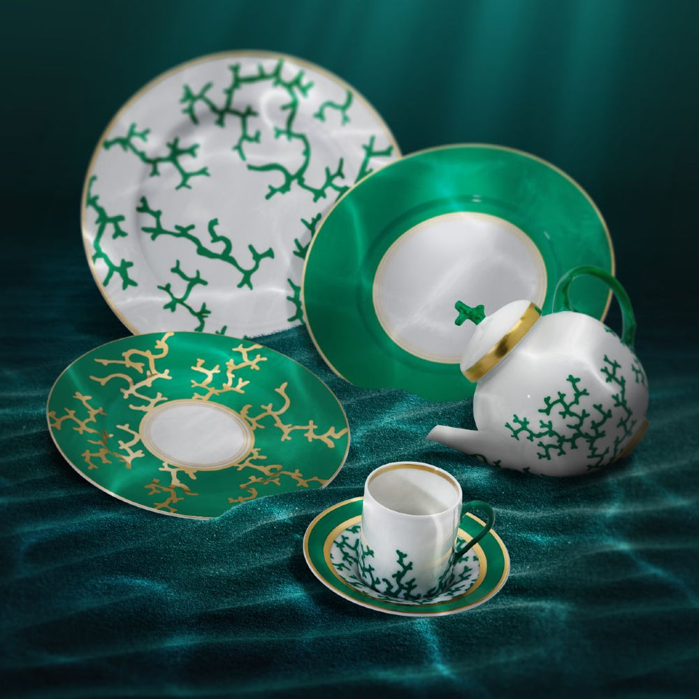 The Cristobal collections Cristobal Rouge, Cristobal Marine, and Cristobal Emerald draw inspiration from rich, global influences. Deep reds, oceanic blues, and lush greens bring depth and drama to the table, each piece framed by intricate detailing that feels both decorative and composed.