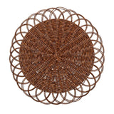 Handwoven from faux rattan, the Alfresco Placemat in brown features a scalloped silhouette that softens its structured weave. The natural tone highlights subtle variations in texture, giving the piece an organic yet tailored presence.