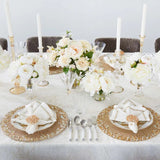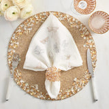 This beaded napkin ring in champagne gold is a true showstopper. Featuring a burst of champagne-colored glass and disc-shaped beads that sparkle in the light, this stunning napkin ring adds a touch of glamour to your table decor. Hand-arranged atop a square lucite ring, its versatility allows it to enhance a lavish table or add sparkle to a more subtle setting, making it a versatile and elegant accessory for your dining experience.
