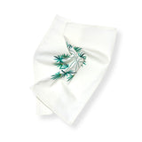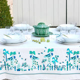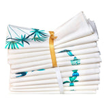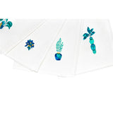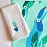 These napkins are assorted with the Baba tablecloth's design. The frieze on the tablecloth's edge depicts an Amazonian landscape, with toucans and monkeys wandering among banana and palm trees while birds fly proudly. The scene is full of colorful and enthusiastic life. Each napkin features a unique pattern extracted from the tablecloth.