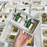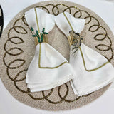 Bamboo motif napkin rings with shiny gold finish. Perfect for summer or tropical-themed table settings. The bamboo sculpture is made of deep green resin, standing out beautifully against the high-shine gold.