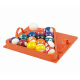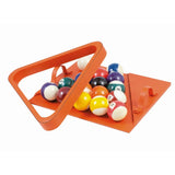 The interior features a removable tray with integrated leather handles and a leather-covered wooden triangle designed for perfect precision when racking the balls. Inside rests a complete set of professional 57.2 mm billiard balls crafted from phenolic resin by Aramith, globally renowned for their superior performance and perfect balance.