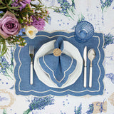 Hand-made blue fabric placemats embroidered with ecru viscose thread. Their wave shaped border and serene colour adds elegance and refinement to the table.