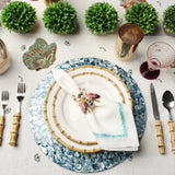 Hand-dyed Capiz shells in deep navy are arranged in a scale-like pattern on the Camellia placemat. Each shell absorbs dye uniquely, creating subtle variations in tone that make every placemat one-of-a-kind. The round silhouette and lustrous finish bring dimension and artistry to the table, making it a standout for summer entertaining.