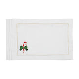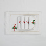 These placemats are made of Italian white cotton half panama. Each piece is embroidered with a candy cane motif, inspired by Saint Nicholas, in viscose thread. A stitched gold border frames the design with elegance. The set of six placemats brings a festive note to the Christmas table while keeping a clean and timeless look.