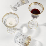 A sophisticated gold inlay graces the rim with intricate detailing, accompanied by fine golden lines on the rim and base, enhancing its royal character. The broad bowl and elegant stem make it an ideal vessel for serving champagne, sparkling wine, or signature cocktails in a way that blends tradition with opulence.