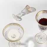 The tall, slender bowl preserves the effervescence of champagne, while the elegant stem ensures a comfortable and graceful hold. A delicate gold inlay with ornate motifs embellishes the rim, complemented by fine golden lines on the base for a regal finish.
