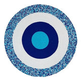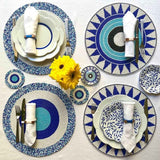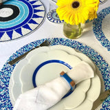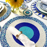 Meticulously crafted, the Charm placemats feature a beautiful design composed of petite glass beads intricately interlaced to form a visually captivating tableau. The placemats showcase a vibrant interplay of brilliant light and dark blues, forming a popping pattern of geometric circles.