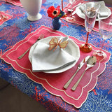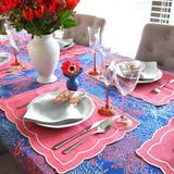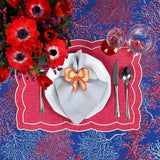 Vibrant and coastal-inspired, the Coastal Seaweed tablecloth in blue and red by Roseberry Home brings artistic flair to elegant seaside interiors.