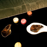 This collection of sensual eating tools explores new ways of eating. Taking inspiration in the tasting of an Oyster, the delicate porcelain shapes invite us to indulge and luxuriate at the dining table. The shell-like tools are made to break table taboos in an elegant way: lick, slurp and pick them up to increase the taste experience and immerse yourself in the moment. The tools are richly textured on the bottom and organically smooth on the top.