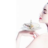 The 'Paradis' porcelain service is the result of a collaboration between the French porcelain manufacturer Raynaud and Fromental, a British interior design company. The British company conjures up 'Haute Couture' fashion for walls, producing luxurious wallpaper. Skilled artists need an inordinate number of hours to produce this intricately embroidered range of wallpaper. The Limoges porcelain service 'Paradis' by Raynaud takes its inspiration from the so-called 'Chinoiserie' paper wallpapers of the British label.