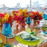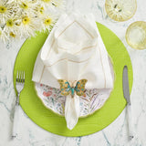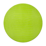 The Croco Placemat in citron green features an embossed faux crocodile texture that adds modern edge to the table. Its round silhouette and vibrant color make it a standout choice for spring and summer entertaining. These round placemats are easy to care for by simply wiping them down before storing.
