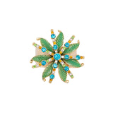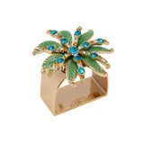 This exquisite napkin ring boasts a beautiful shiny gold finish that exudes luxury and elegance. It features a stunning palm tree with green-shaded leaves that adds a tropical vibe to your dining table. The palm tree is embellished with shimmering silver, light blue, and orange stones that sparkle in the light, catching the eye of all who gaze upon it.