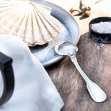 This dessert spoon features a balanced weight and a smooth, ergonomic handle. The Alt-Faden collection is defined by its repeated thread line that ends in a scalloped contour, a design rooted in Augsburg silversmithing traditions from the 18th century.