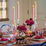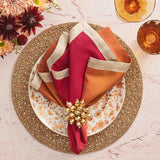 The Dip Dye napkin features an ombre gradation from cranberry red to rust orange. This gorgeous, rich color combination complements any festive fall table. These napkins are hand-dipped, dyed, and accented with a luxurious metallic foil border.