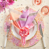 Capiz shells, hand-dyed in pink and orange, form layered petals on the Flora placemat. Each shell is cut into a marquise shape and arranged in a soft ombre effect, highlighting the natural luster and variation of the material.