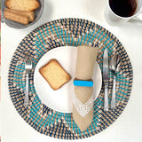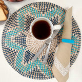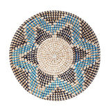 Crafted from an organic foundation of seagrass intricately woven with black and blue strands of colored plastic, these placemats unveil a mesmerizingly pattern. Contrasting bold and neutral colors allow these agrestal placemats to seamlessly complement a variety of home decor, from modern to rustic.