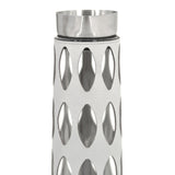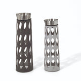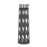 The Glass Carafe Marghe with Leather Cover by Pinetti captures the essence of modern Italian design and exceptional craftsmanship. This elegant cylindrical glass carafe is enveloped in a removable leather sleeve, adorned with distinctive diamond-shaped cutouts that reveal the luminous transparency of the glass beneath.