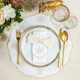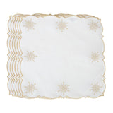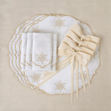 Add a festive glow to your holiday table with these embroidered napkins. Woven from crisp white Italian fabric and embroidered with gold viscose thread, they feature star-shaped snowflakes that reflect the magic of Christmas.