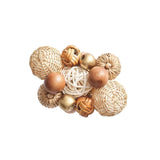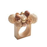 The textured Java Napkin Ring features mini woven baskets in natural colors and materials displayed in a cluster atop a wooden base. Seven types of rattan and wooden beads are polished or woven by hand to create the bead-like baubles on this festive napkin ring.