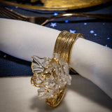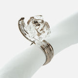 The magical glass artistry that defines Venetian tradition particularly stands out in this romantic glass set of six napkin rings of mouth-blown glass decorated by hand with precious gold details. Each ring is embellished with the fine reproduction of a blooming rosebud that effortlessly enhances the set’s sophistication. Available in gold or platinum silver.