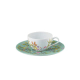 Moka cup and saucer in turquoise from Raynaud’s Paradis collection features bold botanical detailing on fine Limoges porcelain, ideal for stylish espresso service.