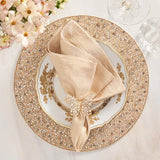 A cascade of gold, blush, and crystal beads forms the intricate surface of the Rapture placemat, each element placed by hand in a shimmering composition. Finished with a gold-beaded border, this round design reflects light beautifully, making it a refined choice for holiday dining or lavish celebrations. The craftsmanship and gem-like detailing create a table accent that is both decorative and enduring.