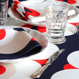 Meticulously crafted from premium-quality fabric, these napkins showcase a captivating deep blue color that provides an ideal backdrop for the whimsical bubble motifs placed at the center. This entanglement of red, white, and ivory bubbles results in a lively and dynamic visual display, giving them extra charm.