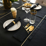 This black table runner features a sleek gold stripe along the edges, adding elegance to your table. Its versatile design makes it suitable for casual dining as well as more formal gatherings. Made from premium 100% Italian linen (200g/m²), it offers a soft yet durable texture that drapes beautifully.