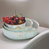 The Large Salad Bowl from the Carlo Este collection by FÜRSTENBERG is a striking centerpiece that unites function with artistry. Designed by Carlo Dal Bianco, the décor showcases a refined interplay of luminous gold and subtle green hues arranged in a mosaic-inspired pattern. On the table, its presence recalls noble elegance while seamlessly fitting into a modern lifestyle.
