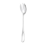 Silver-plated salad serving fork designed with wide tines that provide a secure hold on mixed greens and sliced vegetables. The handle features laurel motifs and has a balanced weight for steady serving when paired with the matching salad spoon.