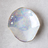 >Please note that the pearlescent finish and golden rim are sensitive and should be treated with the utmost care. If using with cutlery is recommended using only wooden/horn/mother of pearl utensils to avoid scratching. Please hand wash and avoid scrubbing sponges.
