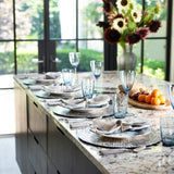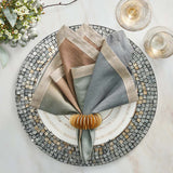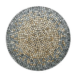 Inspired by mosaic artistry, the Shell Mosaic placemat features hand-cut shells arranged in a radiating ombre pattern. The shells are cooked for the color taupe, while the blue-gray are hand-dyed.