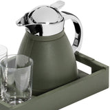 This refined set includes a small Beaubourg tray (PFV021) designed to hold, with perfect stability, two fine crystal glasses and a Chantilly 0.6L insulated carafe. The carafe is crafted from double-walled stainless steel with a polished chrome-plated finish and partially wrapped in sumptuous calfskin golf leather. Its two-chamber structure maintains beverages warm for up to 12 hours and cold for up to 24 hours, ensuring perfect serving conditions at any moment.