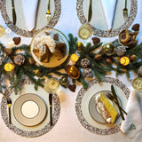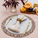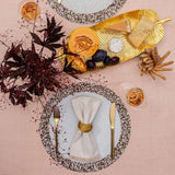 Bronze and white glass beads are hand-applied to create a bold splatter effect across these placemats. The contrast between metallic bronze and crisp white adds a modern edge. Designed to frame dinnerware with texture and shine, these placemats bring depth and artistry to your tablescape.