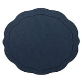 The Tailored Placemat offers a modern twist on the traditional oval shape with a matte faux leather finish. Featuring a stylish wavy edge and tone-on-tone embroidered border, this hard-backed placemat adds sophistication to any table. Available in various colors, the navy option is perfect for a range of occasions, from Hanukkah celebrations to casual dinners, seamlessly fitting both formal and relaxed settings.