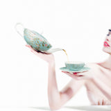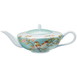 Tea pot in turquoise from Raynaud’s Paradis collection combines vibrant tropical artwork with fine Limoges porcelain, perfect for elegant tea occasions.