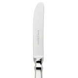 Silver-plated cake/fruit knife, part of the Spaten collection. It features an elongated handle with a straight profile that widens toward the base, creating stable balance and a geometric silhouette. The upper section transitions into a sculpted detail shaped by hand, a design element rooted in early 18th-century silverwork.