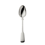 Silver-plated coffee spoon small, part of the Spaten collection. It features an elongated handle with a straight profile that widens toward the base, creating stable balance and a geometric silhouette. The upper section transitions into a sculpted detail shaped by hand, a design element rooted in early 18th-century silverwork.