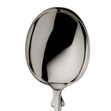 Silver-plated cream spoon (broth spoon), part of the Spaten collection. It features an elongated handle with a straight profile that widens toward the base, creating stable balance and a geometric silhouette. The upper section transitions into a sculpted detail shaped by hand, a design element rooted in early 18th-century silverwork.