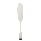 Silver-plated fish serving knife, part of the Spaten collection. It features an elongated handle with a straight profile that widens toward the base, creating stable balance and a geometric silhouette. The upper section transitions into a sculpted detail shaped by hand, a design element rooted in early 18th-century silverwork.