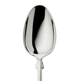 Silver-plated menu spoon, part of the Spaten collection. It features an elongated handle with a straight profile that widens toward the base, creating stable balance and a geometric silhouette. The upper section transitions into a sculpted detail shaped by hand, a design element rooted in early 18th-century silverwork.