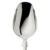 Silver-plated vegetable server, part of the Spaten collection. It features an elongated handle with a straight profile that widens toward the base, creating stable balance and a geometric silhouette. The upper section transitions into a sculpted detail shaped by hand, a design element rooted in early 18th-century silverwork.