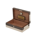 Inside, the humidor features a premium Spanish cedar interior, integrated hygrometer, and adjustable humidification system to maintain optimal conditions for your finest cigars. The exterior showcases refined tonal contrasts, offered in both subtle and bold suede shades, creating a timeless object for collectors who appreciate understated luxury.