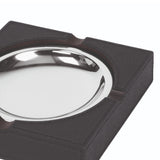 At its center, a removable chrome metal basin provides ease of cleaning and a polished, mirror-like shine that elevates the overall aesthetic. The recessed design allows cigars or cigarettes to rest securely, while the substantial leather base ensures stability on desks, terraces, lounges, and yacht interiors.