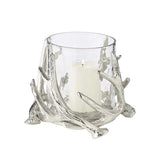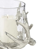 The Kingston Hurricane Candle Holder Silver H 15 cm by Edzard blends nature-inspired design with polished sophistication. Featuring a clear glass bowl set into a base of sculpted deer antlers made from steel, this elegant piece offers a warm, inviting glow that complements both rustic and refined interiors.