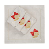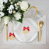 Jingle Bells Mirha Napkins by Roseberry Home bring a timeless festive elegance to holiday table settings. Made from high-quality cotton, each napkin is embroidered with a golden jingle bell tied with a vivid red bow, creating a classic Christmas motif that feels both joyful and refined.