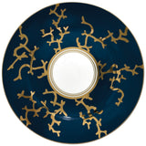 The Dessert Plate Flat Rim No.1 – Cristobal Marine by Raynaud is a striking porcelain piece designed to enhance the presentation of fine desserts. Featuring gold coral branch motifs set against a deep marine blue border, framed with a luminous gold rim, it creates a dramatic and elegant effect at the table.