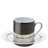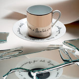 The Coffee Cup Platinum Mirror & Saucer Béatrice from the Jean Cocteau collection by Raynaud blends artistry with refined porcelain savoir-faire. Lacquered with a striking platinum mirror finish, the cup reflects light with brilliance, while the saucer reveals an anamorphic quotation from Jean Cocteau, written in reverse for poetic intrigue.